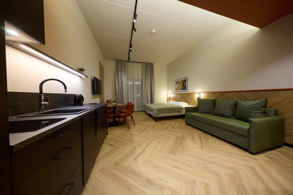 Kaasaaegse sisekujundusega avar köök-tuba kolmele, kus on väike kööginurk ja voodi kahele. Vajadusel saab klient valida, kas soovib kaks eraldi või ühte laia voodit. Lisaks on toas lahtikäiv diivanvoodi kahele ja kaks lahtikäivat diivanvoodit ühele. Toas on teler, pliit, külmkapp, veekeetja, föön, söögilaud ja toolid neljale ning privaatne vannituba dušiga. Kogu hoones on saadaval tasuta ja kiire WiFi. Tuppa pääseb isikliku uksekoodiga. Füüsilisi võtmeid ei ole.
